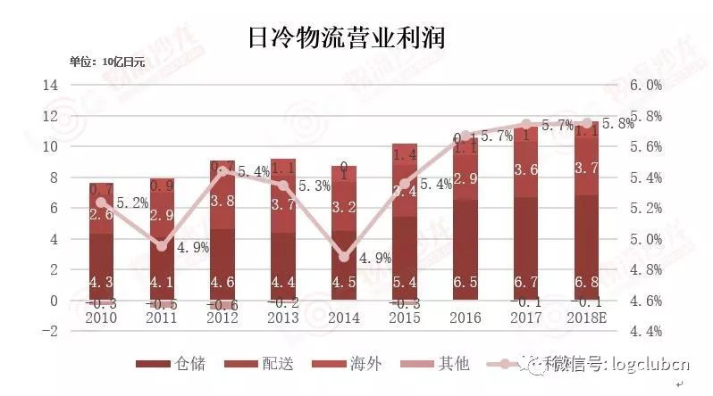 2010-2018年,日冷物流營(yíng)業(yè)收入呈現(xiàn)穩(wěn)中有升,截止至2018年3月,日冷物流營(yíng)業(yè)收入達(dá)到1,950億日元,營(yíng)收增速基本保持在4%左右,同時(shí),日冷物流的營(yíng)業(yè)利潤(rùn)也穩(wěn)定在5%-6%之間,主要原因如下: