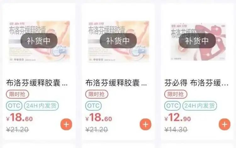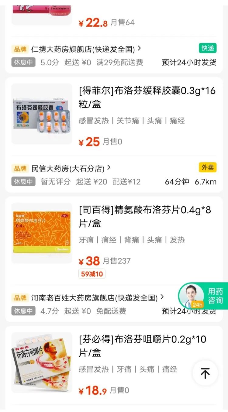 才過了不到3天,國內(nèi)大城市的藥房中,就有很多已經(jīng)買不到布洛芬了,就連線上渠道都顯示售罄。于是,有網(wǎng)友轉(zhuǎn)向偏遠(yuǎn)縣城,以“跑腿+快遞”的方式買空了這些區(qū)域的布洛芬。