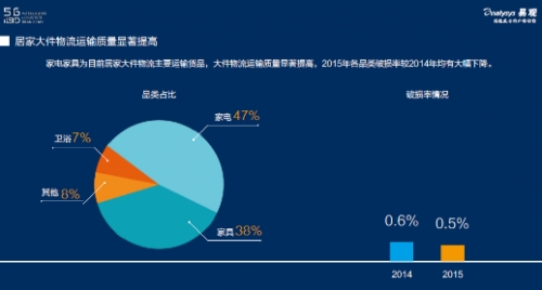 2、大件物流運輸質量顯著提高:破損率上,2015年各品類破損率較2014年有大幅下降;配送品上,種類也呈現(xiàn)逐漸拓展趨勢。