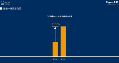 4、送裝一體需求凸顯:從2014年到2015年,日日順物流一體化安裝用戶數(shù)量實現(xiàn)了121%的增長,送裝一體成為新常態(tài)。
