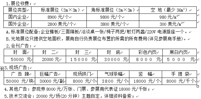 1、榮譽(yù)禮遇 2、開幕式上宣傳 3、會(huì)場廣告宣傳 4、會(huì)刊宣傳 5、專業(yè)觀眾邀請(qǐng)宣傳 6、網(wǎng)站宣傳 7、媒體采訪 8、展位安排 9、研討會(huì)等,具體內(nèi)容請(qǐng)與組委會(huì)聯(lián)系。