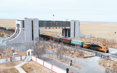 隨著中歐班列開行增多,進出口貨物日益豐富,促進了邊境貿(mào)易發(fā)展。圖為2019年4月18日,一列中歐班列通過內(nèi)蒙古二連浩特國門。        唐 哲攝(人民視覺)