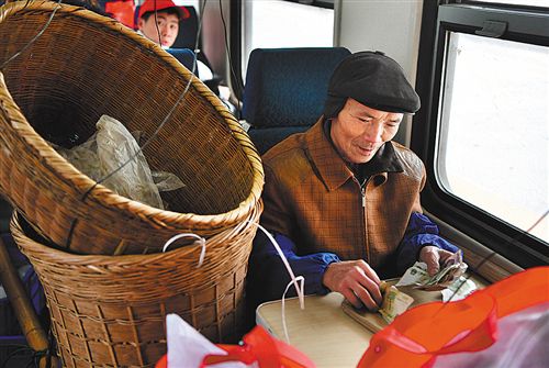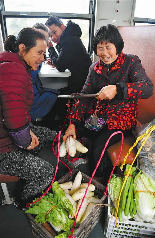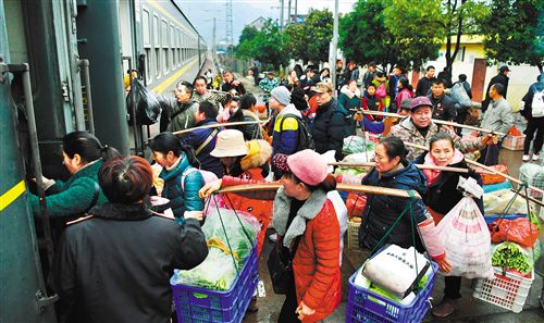 ▲??吭诤鲜÷殛柟赫镜?272次列車,當(dāng)?shù)毓r(nóng)菜農(nóng)挑著擔(dān)子準(zhǔn)備上車。這趟“慢火車”所經(jīng)過的地區(qū)多為“老少邊窮”,經(jīng)濟欠發(fā)達(dá)。為盤活沿途百姓致富渠道,鐵路部門開“綠燈”允許乘客攜帶大量鮮活貨物乘車。