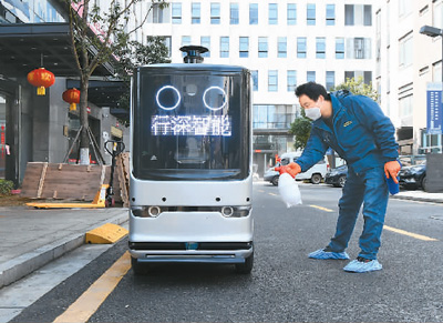 2月14日,一次配送任務(wù)完成后,工作人員為“超影”配送機(jī)器人噴灑酒精消毒?! ⌒氯A社記者 薛宇舸攝