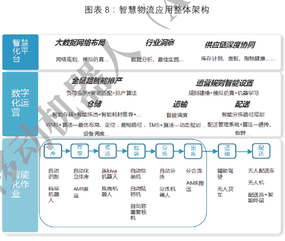 從其中可以看出,智能化作業(yè)即智能物流是智慧物流應用的基礎環(huán)節(jié),智能物流更強調(diào)的是能力,需要通過新技術的不斷研發(fā)、創(chuàng)新來進行更新和迭代;而智慧物流則是一種整體模式,強調(diào)系統(tǒng)的互聯(lián)互通及深度協(xié)同。