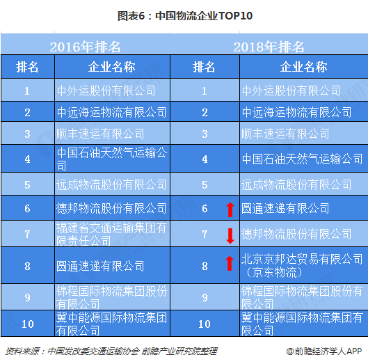 ——巨頭地位整體穩(wěn)固。物流滲透在社會(huì)生產(chǎn)和居民生活的各個(gè)方面,整個(gè)經(jīng)濟(jì)社會(huì)的運(yùn)行離不開(kāi)商品的流通,物流行業(yè)的發(fā)展帶來(lái)了行業(yè)內(nèi)相關(guān)企業(yè)的壯大,一批巨頭企業(yè)通過(guò)整合與深化服務(wù),在行業(yè)內(nèi)占據(jù)了領(lǐng)先地位。由發(fā)改委交通運(yùn)輸協(xié)會(huì)主辦的中國(guó)先進(jìn)物流企業(yè)評(píng)選結(jié)果顯示,中外運(yùn)股份有限公司、中遠(yuǎn)海運(yùn)物流有限公司、順豐速運(yùn)有限公司、中國(guó)石油天然氣運(yùn)輸公司、遠(yuǎn)成物流股份有限公司穩(wěn)穩(wěn)占據(jù)2016年、2018年中國(guó)物流企業(yè)百?gòu)?qiáng)排名的前五位。