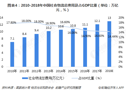 根據(jù)統(tǒng)計(jì)數(shù)據(jù)顯示,2017年,我國(guó)物流總費(fèi)用為12.1萬(wàn)億元,占GDP比重為14.6%;物流與采購(gòu)協(xié)會(huì)最新數(shù)據(jù)顯示,2018年1-11月我國(guó)物流總費(fèi)用為11.9萬(wàn)億元,同比增長(zhǎng)8.6%,據(jù)此預(yù)計(jì)2018年全年物流總費(fèi)用約為13萬(wàn)億元,占全年GDP比重約為14.4%,較2017年下降0.2個(gè)百分點(diǎn)。
