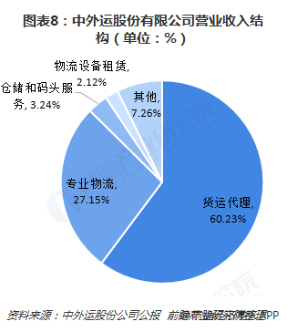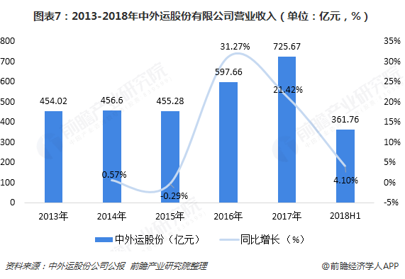 從具體排名情況來(lái)看,中外運(yùn)股份有限公司、中遠(yuǎn)海運(yùn)物流有限公司和遠(yuǎn)成物流股份有限公司等作為綜合性的物流企業(yè),在物流企業(yè)百?gòu)?qiáng)評(píng)選中維持著穩(wěn)定地位,分別處在第一、第二和第五位。其中中外運(yùn)股份有限公司憑借強(qiáng)大的綜合物流服務(wù)能力,牢牢占據(jù)行業(yè)領(lǐng)先地位。2013-2018年,公司的營(yíng)業(yè)收入整體提高明顯。2017年公司實(shí)現(xiàn)營(yíng)業(yè)收入725.67億元,同比增長(zhǎng)21.42%。2018年上半年公司實(shí)現(xiàn)營(yíng)業(yè)收入361.76億元,其中貨運(yùn)代理業(yè)務(wù)收入為217.88億元,占比60.23%;專業(yè)物流業(yè)務(wù)實(shí)現(xiàn)營(yíng)業(yè)收入98.23億元,占比27.15%;倉(cāng)儲(chǔ)和碼頭業(yè)務(wù)營(yíng)業(yè)收入11.74億元,占比3.24%;物流設(shè)備租賃收入7.66億元,占比2.12%。