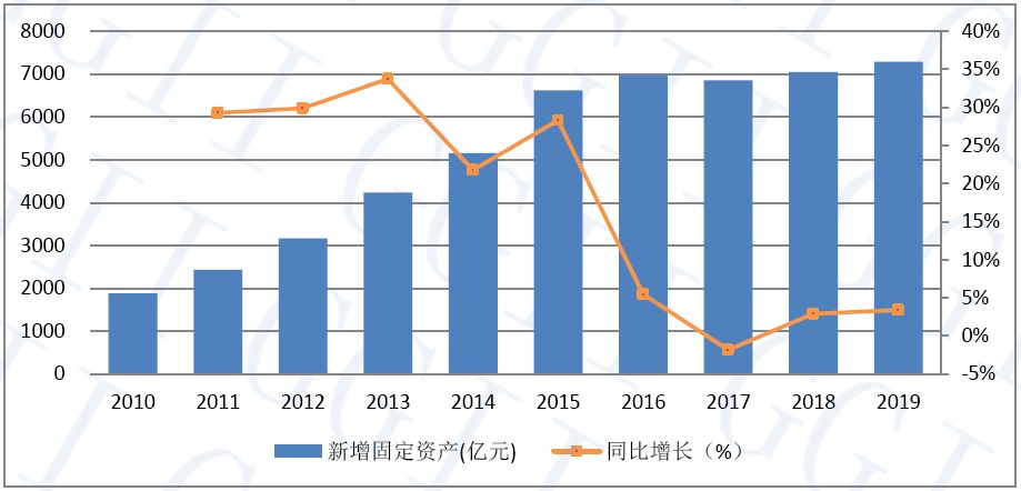 2010-2019年倉儲行業(yè)新增固定資產(chǎn)規(guī)模(單位:億元,%)