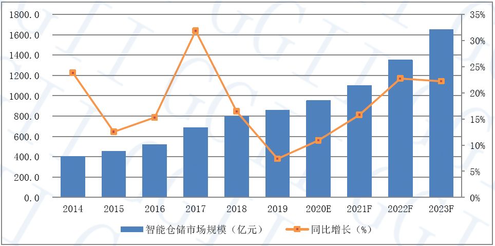 2014-2023年智能倉儲市場規(guī)模及預測(單位:億元,%)