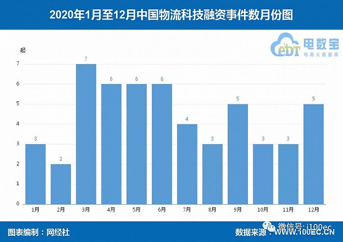 融資月份上,2020年中國物流科技融資事件數(shù)月份分布上,排名第一的是3月占7起,4月、5月和6月并列第二,占6起融資事件、9月、12月并列,融資事件數(shù)皆為5起,位列第三。從整體來看,物流科技融資在上半年較為活躍。