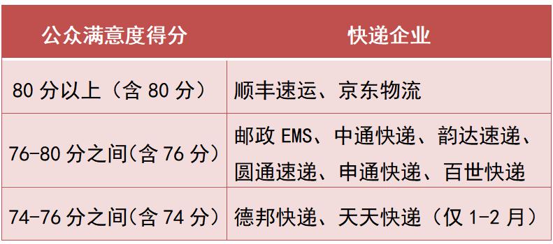 在快遞企業(yè)公眾滿意度方面,得分在80分以上(含80分)的企業(yè)為順豐速運、京東物流,得分在76-80分之間(含76分)的企業(yè)為郵政EMS、中通快遞、韻達速遞、圓通速遞、申通快遞、百世快遞,得分在74-76分之間(含74分)的企業(yè)為德邦快遞、天天快遞(僅1-2月)。
