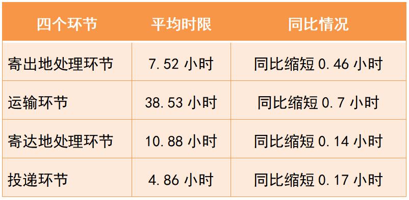 從分環(huán)節(jié)來看,四個環(huán)節(jié)時限同比均有改善。寄出地處理環(huán)節(jié)平均時限為7.52小時,同比縮短0.46小時;運輸環(huán)節(jié)平均時限為38.53小時,同比縮短0.7小時;寄達地處理環(huán)節(jié)平均時限為10.88小時,同比縮短0.14小時;投遞環(huán)節(jié)平均時限為4.86小時,同比縮短0.17小時。