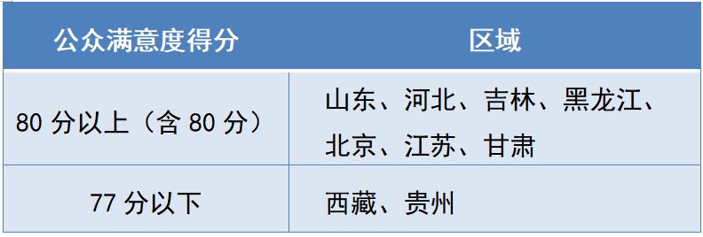 在區(qū)域公眾滿意度得分方面,山東、河北、吉林、黑龍江、北京、江蘇、甘肅得分在80分以上(含80分),表現(xiàn)較好;西藏、貴州得分不滿77分,有進一步提升空間。