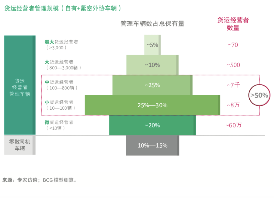 似乎這樣的貨運經營者管理規(guī)模結構圖已經與行業(yè)認知產生了差異,但 BCG董事總經理、全球合伙人葛磊表示, 這樣的結構更貼近中國公路貨運的真實情況。
