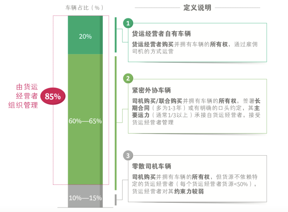 在 BCG的《中國公路貨運市場發(fā)展趨勢》報告中, 只要一個車隊、物流公司掌握了一個社會化運力超過1/3的穩(wěn)定貨源時,就可以將這個運力歸入貨運經營者的管理規(guī)模之內。