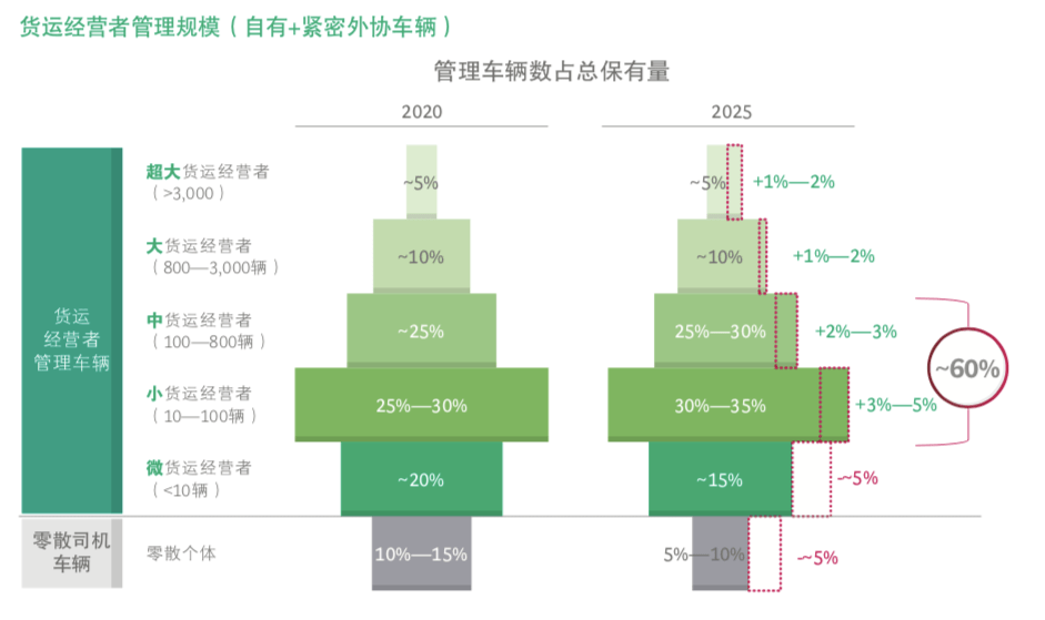 在這樣不同的努力方向下,報告 對未來5年的貨運經營者管理規(guī)模趨勢進行了預測:中小貨運經營者的整體規(guī)模將小幅擴張,管理的車輛數(shù)占比將提升5%— 8%。部分貨源能力特別強的中等貨運經營者擴張至大貨運經營者行列,管理的車輛數(shù)占比提升1%—2%。超大經營者數(shù)量相對穩(wěn)定,但管理車輛數(shù)會提升約1%—2%。