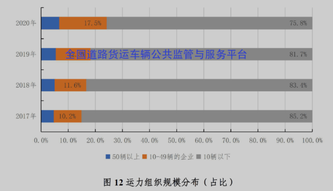 同時,從運力規(guī)模來看,擁有車輛50輛以上的普通貨運企業(yè)占經營業(yè)戶總數(shù)的6.7%,10輛以下的普通貨運企業(yè)占企業(yè)總數(shù)的75.8%。