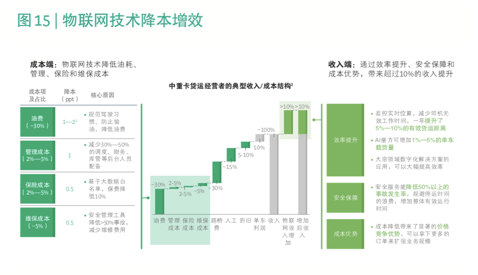 比如效益方面,可以利用甩掛、甩箱解決方案、AI量方、油耗檢測、IoT+保險、車輛調度、在線結算、油卡、ETC等實現(xiàn)降本增效。