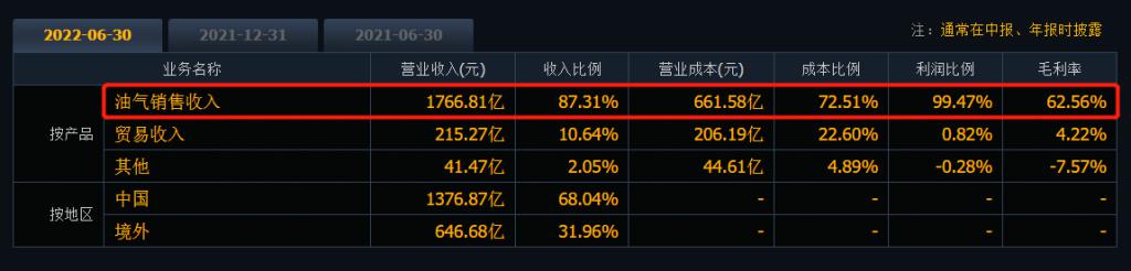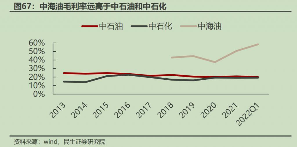 周泰同時指出,相比中石油和中石化,中海油勘探開發(fā)的單一業(yè)務結構在油價高增背景下盡享業(yè)績紅利。除了油氣勘探開發(fā)外,中石油和中石化還覆蓋煉油和化工業(yè)務。而煉油化工是原油勘探的下游,油價高漲造成的高原料成本將對業(yè)績釋放形成一定拖累。2022Q1,中石油和中石化綜合毛利率分別為 19.98% 和 19.25%,中海油則為 58.38%,顯著高于前兩者。