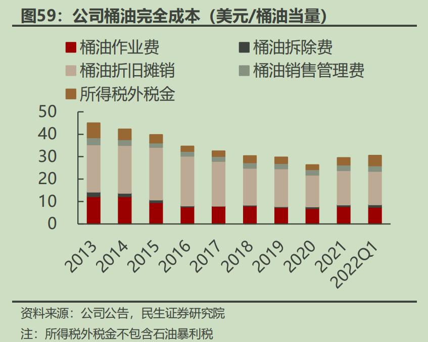 低成本是石油公司對抗油價波動風險和提升盈利的關鍵。2022H1 中國海油桶油主要成本為 30.32 美元 / 桶油當量,在國際油價大幅上漲 61% 的環(huán)境下,桶油主要成本同比僅上漲 4.6%,信達證券分析師在 8 月 26 日發(fā)布的研報中指出,全球海上油服行業(yè)仍相對過剩,雖然油價上漲,但油服作業(yè)費用漲幅有限,隨著公司繼續(xù)加大勘探開發(fā)力度,折舊攤銷成本有望維持低位,公司低桶油成本競爭優(yōu)勢將繼續(xù)鞏固