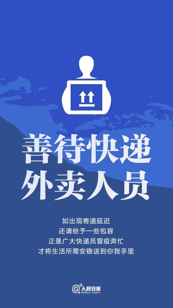 近日,人民日?qǐng)?bào)也呼吁:“善待外賣(mài)快遞人員。如果寄遞延遲,還請(qǐng)給與一些包容。正是廣大快遞員冒疫奔忙,才將生活所需安穩(wěn)送到你我手里?!?/p>
