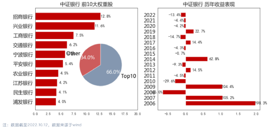 目前,A股市場跟蹤銀行業(yè)的重要指數(shù)是中證銀行指數(shù)(399986.SZ),從權(quán)重上看,中證銀行指數(shù)中,股份制銀行占比43.6%,城商行及農(nóng)商行占比31.1%,國有大型銀行占比25.3%。其中,前十大成分股占比合計66%。