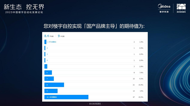 論壇現(xiàn)場發(fā)起了關(guān)于“樓宇自控行業(yè)國產(chǎn)化進(jìn)展”的調(diào)查問卷,希望從不同角色的角度共同勾勒出未來中國樓宇自控行業(yè)的領(lǐng)軍者的畫像,以及在國產(chǎn)主導(dǎo)的進(jìn)程上需要做對什么事情。現(xiàn)場共回收有效問卷108份,受訪者對樓宇自控實(shí)現(xiàn)“國產(chǎn)品牌主導(dǎo)”的”凈推薦值”(NPS)為45.2%,其中期待值為10——非常期待的有43.5%。
