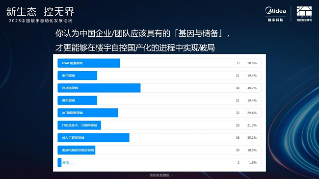 對于中國企業(yè)/團(tuán)隊(duì)在樓宇自控國產(chǎn)化的進(jìn)程中實(shí)現(xiàn)破局應(yīng)該具有的“基因與儲備”,投票結(jié)果前三的為:自動化領(lǐng)域(占比40.7%)、AI人工智能領(lǐng)域(占比35.2%)以及HVAC暖通領(lǐng)域(占比30.6%)。