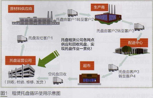 租賃制的托盤系統(tǒng)由一個(gè)專營企業(yè)運(yùn)作,它擁有大批托盤,可以滿足目標(biāo)客戶的需求,同時(shí)在各地建立托盤租賃營業(yè)點(diǎn)、倉庫和回收點(diǎn),分別負(fù)責(zé)托盤的市場營銷、托盤供應(yīng)、回收和維護(hù)工作。使用托盤的企業(yè),可以向該公司租用所需數(shù)量的托盤,在受貨地點(diǎn)將空托盤還給就近的托盤回收點(diǎn),按照合同付給必要的租金即可。如圖1所示,制造企業(yè)、運(yùn)輸公司、受貨企業(yè)都不需要擁有托盤,免去了管理托盤的麻煩,使得托盤作業(yè)一貫化能夠順利實(shí)施,所使用托盤的總量也大為減少。
