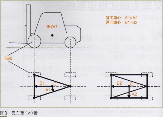 叉車行駛時要保持穩(wěn)定,重心G必須落在圖3穩(wěn)定三角形內(nèi),但在急速轉(zhuǎn)彎時車身傾斜,重心G即可能落在穩(wěn)定三角形外,造成一側(cè)的車輪離地,車輛就可能發(fā)生傾翻。要避免這種情況發(fā)生,必須擴大穩(wěn)定區(qū)域,如果能在轉(zhuǎn)彎時通過鉸軸連接的車架與后橋鎖定,這時叉車就成為四點支撐,形成穩(wěn)定四邊形區(qū)域(見圖3)。這時,重心縱向距離不變,側(cè)向距離增大,即B1=B2,A1