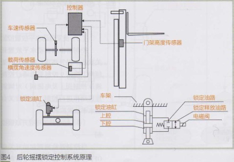 平衡重式四支點叉車的后橋中心與車架是鉸軸連接,叉車后輪軸的中心和兩個前輪是支撐車體的3個支點,構成所謂的叉車重心穩(wěn)定的三角形。在凹凸路面上,通過后輪軸的上下?lián)u擺來吸引凹凸路面帶來的振動。但叉車在急速拐彎時會出現(xiàn)車輛傾斜,導致重心偏移,嚴重的會造成車輛側(cè)翻,特別是在貨叉高載重并處于高位時急轉(zhuǎn)彎,發(fā)生側(cè)翻的可能性很大。在叉車各類安全事故中,叉車傾翻造成事故約占42%。因此,提高叉車轉(zhuǎn)彎穩(wěn)定性是減少這類事故的關鍵措施。后輪搖擺鎖定控制系統(tǒng)(Active control rear stabilizer)就是專為避免這類安全事故的解決方案,通過減小車輛急速拐彎時的傾斜度,使叉車轉(zhuǎn)彎時更穩(wěn)定,更快速。