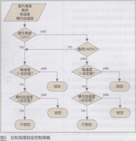 如圖4所示,后輪搖擺鎖定控制系統(tǒng)由鎖定油缸、電磁閥、載荷傳感器、橫擺角速度傳感器、車速傳感器、門架高度傳感器、控制器等構成。鎖定油缸的鎖定與釋放由電磁閥接受控制器指令進行控制,電磁閥為二位二通電磁閥,電磁閥在鎖定釋放位置,鎖定油缸上下腔連通,車架可自由擺動,叉車處于正常三支點狀態(tài);電磁閥在鎖定位置,鎖定油缸上下腔關斷,車架與后橋剛性連接,叉車成為四支點支撐,提高了穩(wěn)定性。