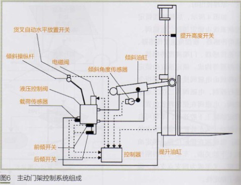 如圖6所示,門架主動控制系統(tǒng)的控制輸入包括傾斜操縱桿(帶自動水平放置開關)、傾斜角度傳感器、載荷傳感器、前傾開關、后傾開關、門架高度開關,控制執(zhí)行器包括控制閥、電磁閥、傾斜油缸、提升油缸等。