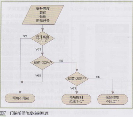 門架前傾角度控制是根據(jù)載荷和貨叉提升高度控制門架前傾角度,避免操作員操作時無意中過分前傾造成貨物墜落或叉車傾翻。