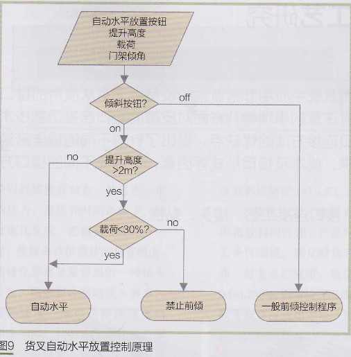 控制器檢測自動水平放置開關狀態(tài)、提升高度、載荷、門架傾角,按圖9控制要求通過控制液壓控制閥(及電磁閥)對傾斜油缸動作進行控制,實現(xiàn)貨叉自動水平放置控制。