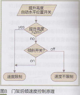 控制器檢測提升高度及自動水平放置開關,按圖8控制要求通過控制液壓控制閥(及電磁閥)對傾斜油缸動作進行控制,實現(xiàn)后傾速度控制。