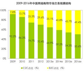 網(wǎng)購市場規(guī)模來看,目前C2C的銷售仍占據(jù)市場的大部分,但是B2C的銷售份額在快速上升。2009年大型企業(yè)的銷售份額僅占7.8%,但預計到2016年,B2C的銷售份額可接近市場的一半。