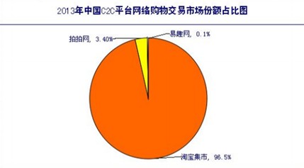據(jù)中國電子商務(wù)研究中心(100EC.CN)監(jiān)測數(shù)據(jù)顯示,從 C2C 市場來看,淘寶集市地位依舊穩(wěn)固,截至到 2013 年 12 月淘寶占全部的 96.5%。 拍拍網(wǎng)占 3.4%,易趣網(wǎng)占 0.1%。中國 C2C 網(wǎng)絡(luò)購物市場格局相對穩(wěn)定,各網(wǎng)站占比趨于穩(wěn)定,交易規(guī)模平穩(wěn)增長。