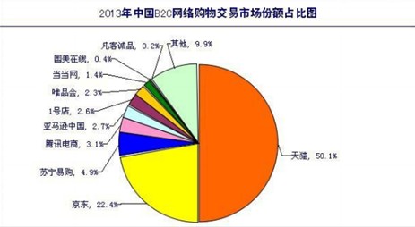 據(jù)中國電子商務(wù)研究中心(100EC.CN)監(jiān)測數(shù)據(jù)顯示,2013 年中國 B2C 網(wǎng)絡(luò)零售市場 (包括平臺式與自主銷售式), 排名第一的依舊是天貓商城,占50.1%;京東名列第二, 占據(jù)22.4%;位于第三位的是蘇寧易購達到 4.9%;后續(xù) 4-10 位排名依次為:騰訊電商(3.1%)、亞馬遜中國(2.7%)、1 號店(2.6%)、唯品會(2.3%)、當當網(wǎng)(1.4%)、國美在線(0.4%)、凡客誠品(0.2%)。
