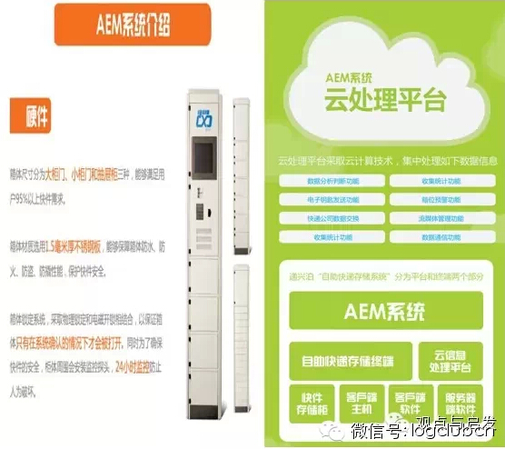 2012年自主研發(fā)的“自助快遞存儲系統(tǒng)”,簡稱AEM(Auto Express Machine)系統(tǒng),利用云計算、移動互聯(lián)網(wǎng)、物聯(lián)網(wǎng)等信息技術(shù),將快遞行業(yè)以往人對人的傳遞,轉(zhuǎn)化為人機對話的形式。同時具有直購、寄存轉(zhuǎn)交、本地服務(wù)(商務(wù))信息、配送服務(wù)、金融服務(wù)等輔助業(yè)務(wù)拓展空間;