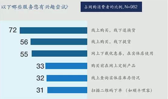2014年,中國消費(fèi)者對O2O的預(yù)期也變得更清晰:針對貨物和商品,72%的消費(fèi)者希望O2O可以提供網(wǎng)購商品線下退貨,56%的人希望可以線上下單、線下取貨。