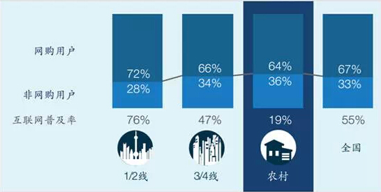 在具體數(shù)字上,第一互聯(lián)網(wǎng)的普及率在一二線達(dá)到76%,到三四線是47%,到農(nóng)村19%,但是在被滲透的這些人群當(dāng)中,用過電子商務(wù)網(wǎng)購用戶,19%普及互聯(lián)網(wǎng)的人群里面有64%用過網(wǎng)購。