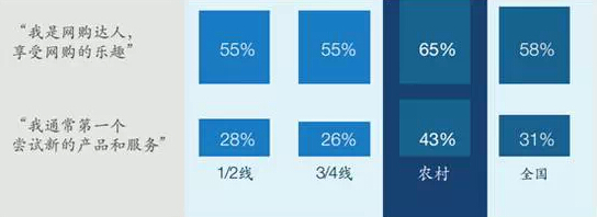 農(nóng)村用戶中的“網(wǎng)絡(luò)達(dá)人”更是比一線及二線城市多出25%,渴望第一個嘗試新的產(chǎn)品和服務(wù)。