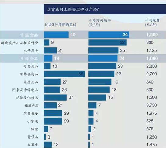 盡管中國消費(fèi)者更傾向于在線上購買服飾類商品(66%的人在過去3個月內(nèi)購買過),但他們購買得最頻繁的卻是常溫和生鮮食品(食品購買頻次是34次/年,服飾類是22次/年)。40%的中國消費(fèi)者網(wǎng)購食品,而美國網(wǎng)購食品的消費(fèi)者只有10%。