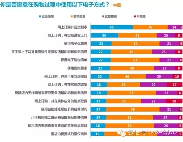 調(diào)查還顯示,18%的中國(guó)受訪者表示會(huì)登錄店鋪Wi-Fi來(lái)獲取產(chǎn)品信息或價(jià)格,17%的人則會(huì)通過(guò)掃描二維碼的方式獲取所需信息,使用店內(nèi)電腦查閱產(chǎn)品信息的消費(fèi)者占16%。分別有75%、78%和79%的中國(guó)受訪者表示未來(lái)愿意嘗試這些電子方式在實(shí)體店鋪購(gòu)物。