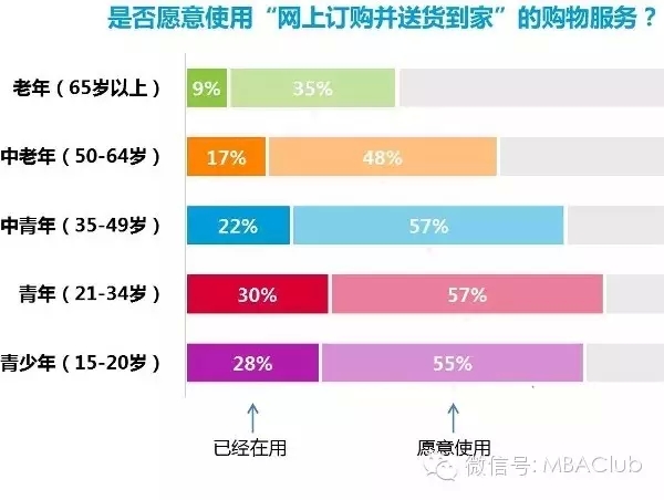 調(diào)查顯示,9%的老年人(65歲以上)、17%的中老年(50-64歲)、22%的中青年(35-49歲)、30%的青年群體(21-34歲)、28%的青少年(15-20歲)已經(jīng)使用了網(wǎng)絡(luò)購(gòu)物送貨上門(mén)的服務(wù)形式。其中,年輕受訪者表示他們未來(lái)愿意使用各種線(xiàn)上購(gòu)物方式。