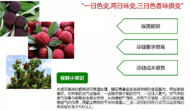 第一期我們講《腐損居高不下的生鮮行業(yè)》。我們先來講一種很有特色的水果——楊梅。楊梅保質(zhì)期很短,而且極難保存,在民間一直就有“一日色變,兩日味變,三日色香味俱變”的說法,這就大大限制了楊梅的銷售時(shí)間和地點(diǎn)。隨著冷鏈?zhǔn)袌?chǎng)的迅速發(fā)展,現(xiàn)在已經(jīng)可以通過冷庫(kù)儲(chǔ)存和冷鏈運(yùn)輸方式來延長(zhǎng)楊梅的保質(zhì)期,但這不僅對(duì)冷鏈技術(shù)提出了很高的要求,而且會(huì)使成本大大增加。