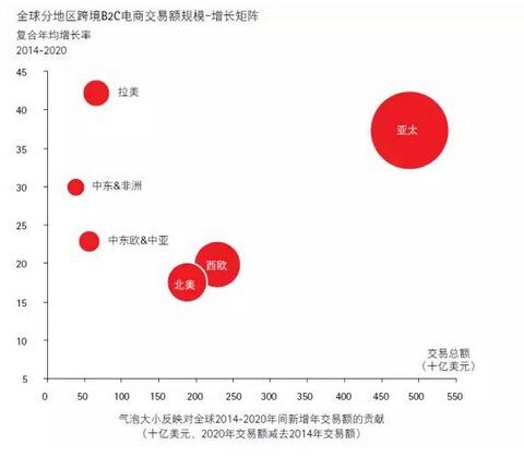 6月11日,阿里研究院與埃森哲在北京聯(lián)合發(fā)布全球跨境B2C電商趨勢(shì)報(bào)告,預(yù)測(cè)2020年全球跨境B2C電商交易額將達(dá)到9940億美元,惠及9.43億全球消費(fèi)者,其中,以中國(guó)為核心的亞太地區(qū)以53.6%的新增交易額貢獻(xiàn)度位居首位。