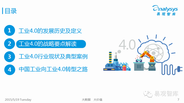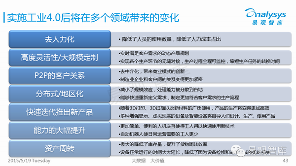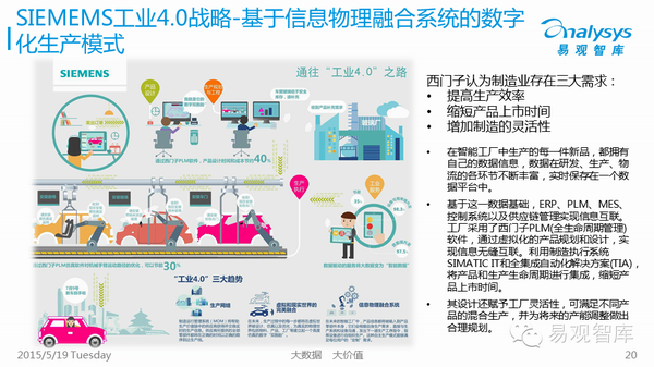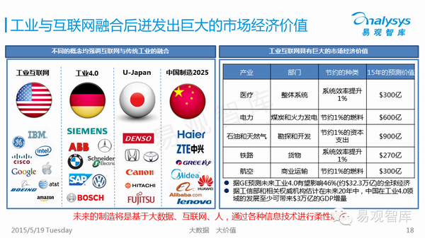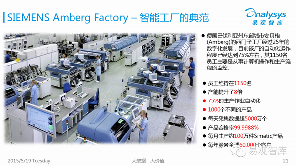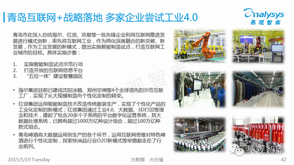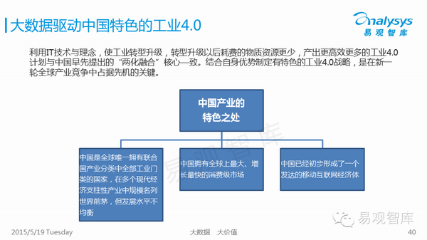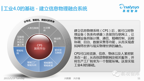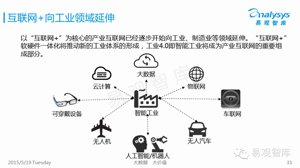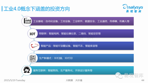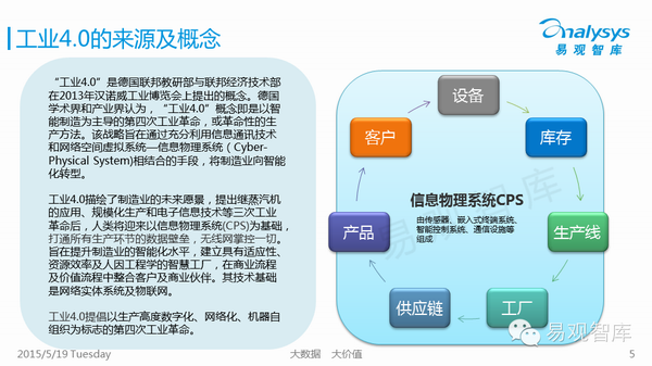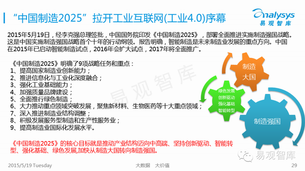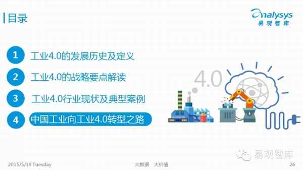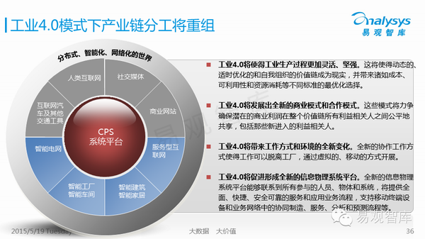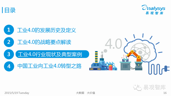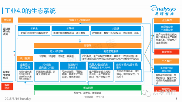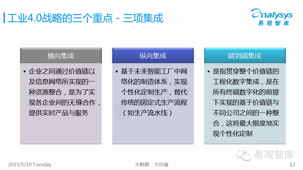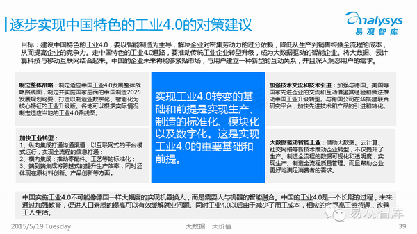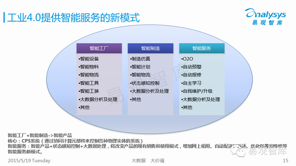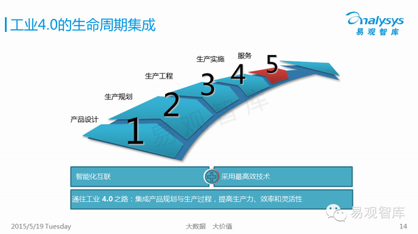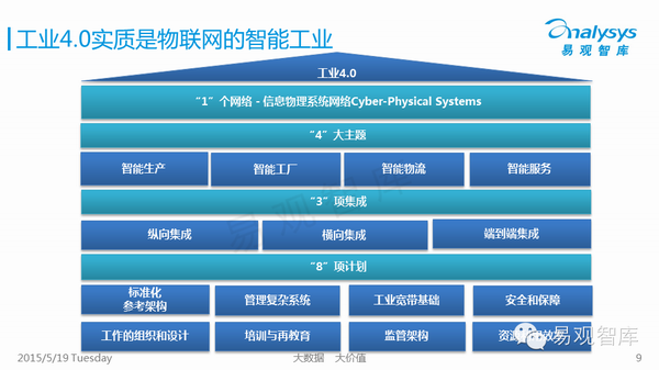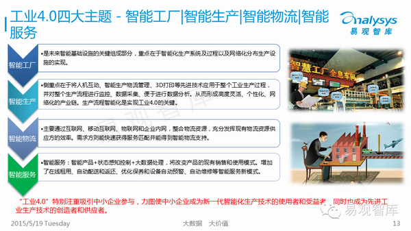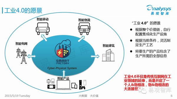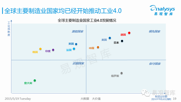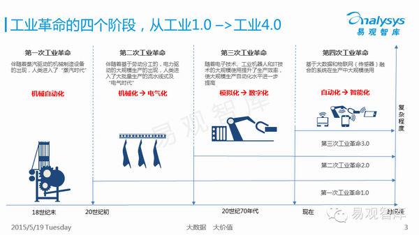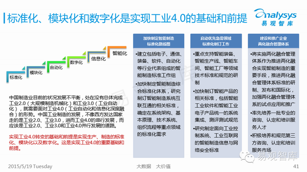 易觀智庫(kù)發(fā)布了《工業(yè)4.0專題研究報(bào)告2015》,報(bào)告分析認(rèn)為中國(guó)工業(yè)雖然是全球第一的制造業(yè)大國(guó),但是現(xiàn)代化,信息化水平區(qū)域發(fā)展參差不齊,標(biāo)準(zhǔn)化程度低,處于工業(yè)2.0、工業(yè)3.0并存階段。